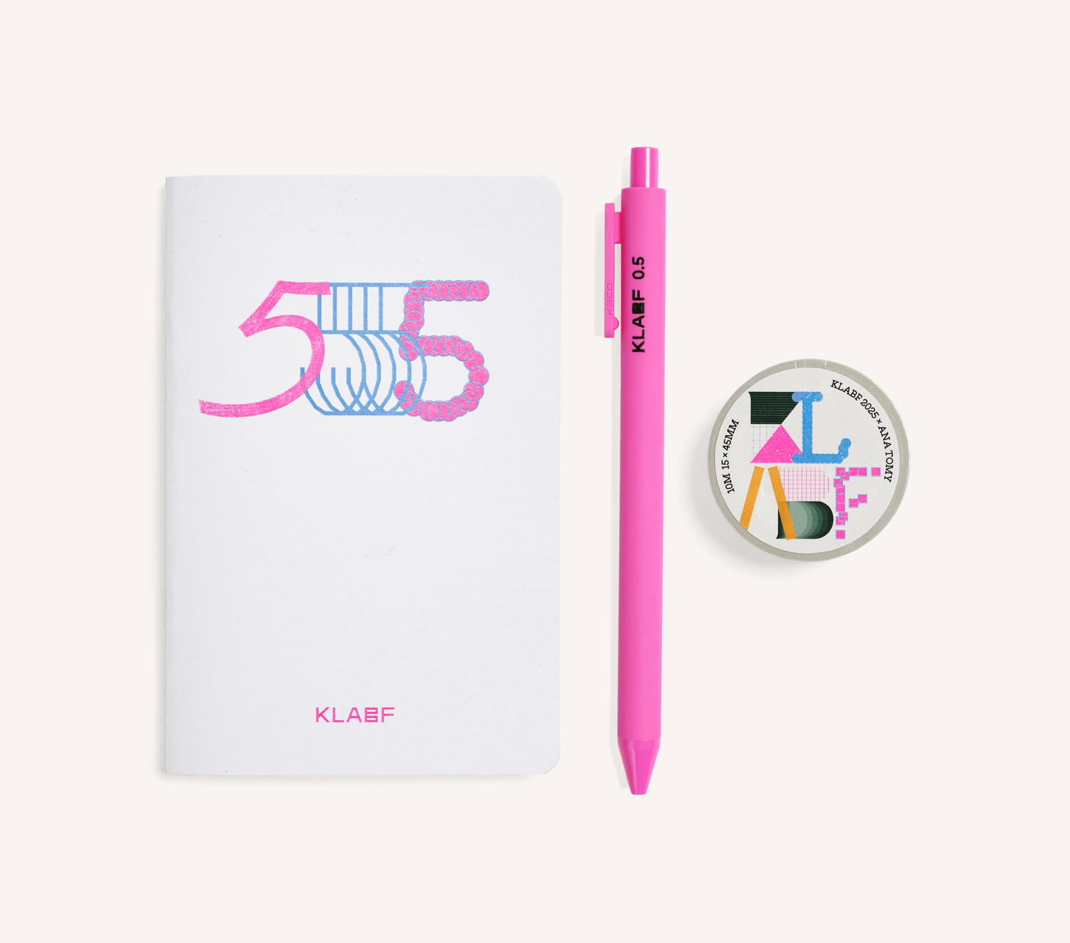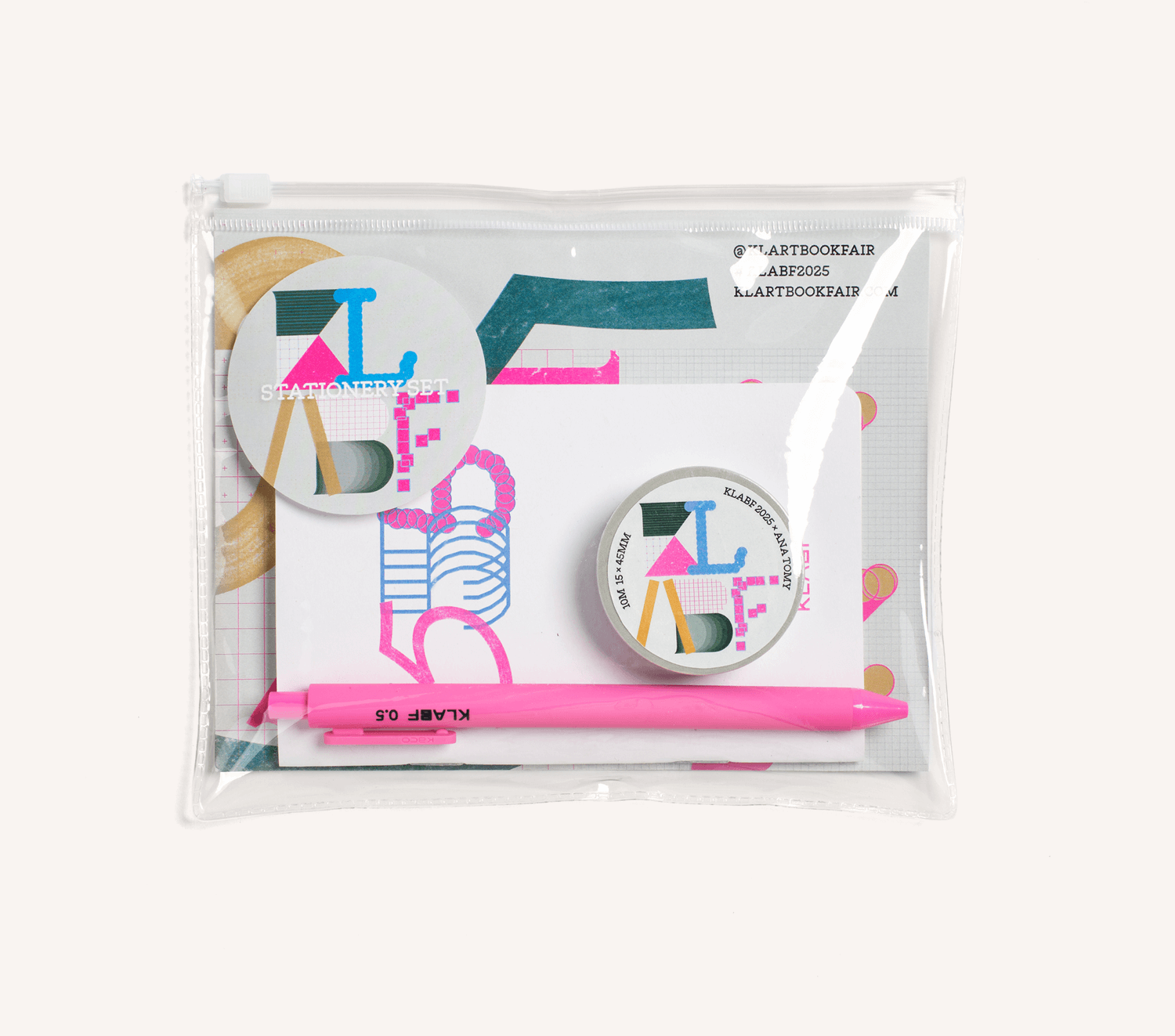 A pocket-sized dose of creativity, made just for KLABF. Inside the clear zip pouch, you’ll find a mini notebook, gel ink pen, and washi tape, each featuring playful colours and bold KLABF graphics. Use it to jot, doodle, tape, and dream your way through the fair (and beyond). Made to move with you, from one idea to the next.