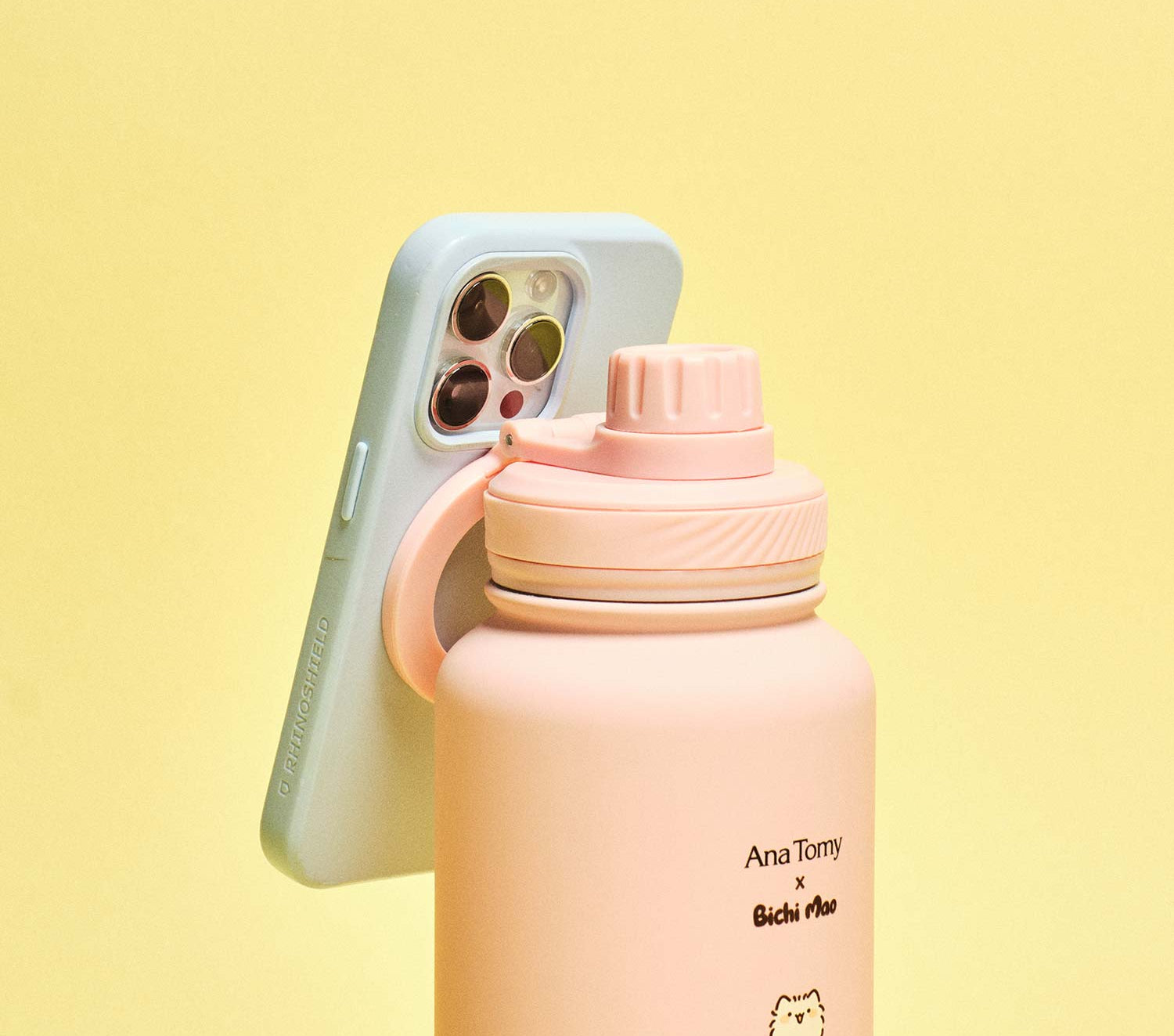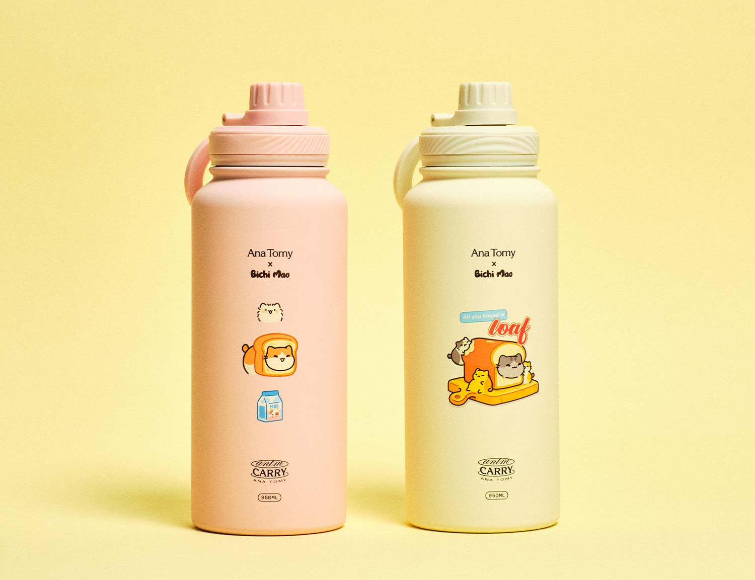 Start your day with the Ana Tomy x Bichi Mao insulated bottle (950ml). It comes with two interchangeable lids, one of them magnetic for your MagSafe phone. Double wall vacuum insulation keeps your drinks hot or cold, while the wide opening makes ice storage and cleaning easy. From morning coffee to fresh juice, sip, share and carry your day with a playful twist.